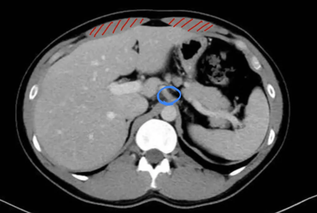 上の図は腹腔神経叢のレベル(みぞおちの位置)のCT画像です。CT画像の見方については、仰向けの人を輪切りにして、足元側から見ているのをイメージしてください。つまり、画像の上が腹側、下が背側、画像左が身体の右側、画像の右が身体の左側となります。この図の青丸が腹腔神経叢の位置です。筋肉は赤の斜線で示しており、こちらは腹直筋になります。骨は白色に映ります。この場合、腹腔神経叢を守るものとして腹直筋(赤い斜線)があるのですが、身体の中心は腹直筋の腱(スジみたいなもの)で構成されており、ここはいくら筋トレをしても太くなりません。つまり腹腔神経叢を守るために腹直筋を肥大させることはあまり意味がないと考えられます。次に肝臓について考えてみましょう。