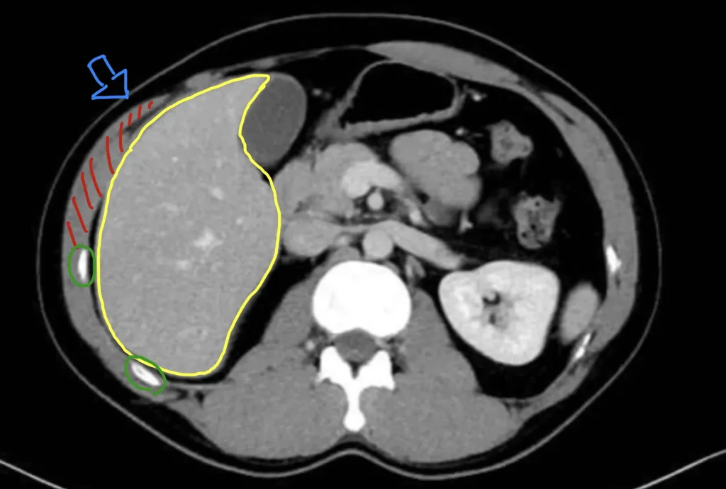 この図は肝臓の下の方のCT画像です。黄色の線で囲われている部分が肝臓の下部です。赤色の斜線が筋肉(今回は外腹斜筋、内腹斜筋、腹横筋が含まれます)で、緑で囲われている白く光っているものが肋骨です。この図から分かるように、この位置では肝臓は肋骨に守られておらず、薄い筋肉があるのみです。また筋肉も付着部に近く、鍛えても十分に太くはなりません(どんなに鍛えても力こぶの肘の付け根が太くならないイメージ)。よってボディブローのような青矢印の力に対しては、筋力トレーニングでは対応できないことになります。