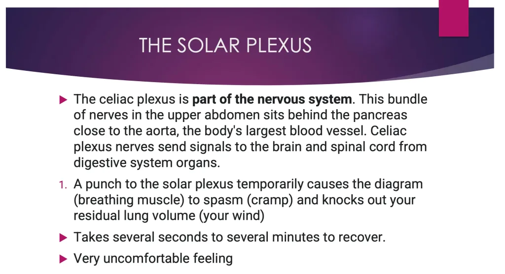 みぞおちへの衝撃は腹部中央に位置する腹腔神経叢(太陽神経叢)に影響を与えます。ここが刺激されてもどういうわけか横隔膜が痙攣を起こすようです(横隔膜の運動繊維は横隔神経(C4)であり、腹腔神経叢との関連がわからない…)。上のスライドは、Association of Boxing Commissions and Combative Sportsという機関のDr. Michael Schwartzとうい医師の作成したものですが、同様のことが記載されております。