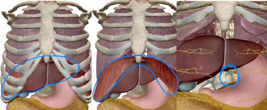 肝臓は左の図が示すように、肋骨に守られるように存在している臓器です。身体の右側を占める割合が多いのが特徴です。肝臓の真上には横隔膜、さらにその上には肺があり、息を吸った際には肺が膨らむことで肝臓の右側は肋骨から下へ少しはみ出るようになります。
