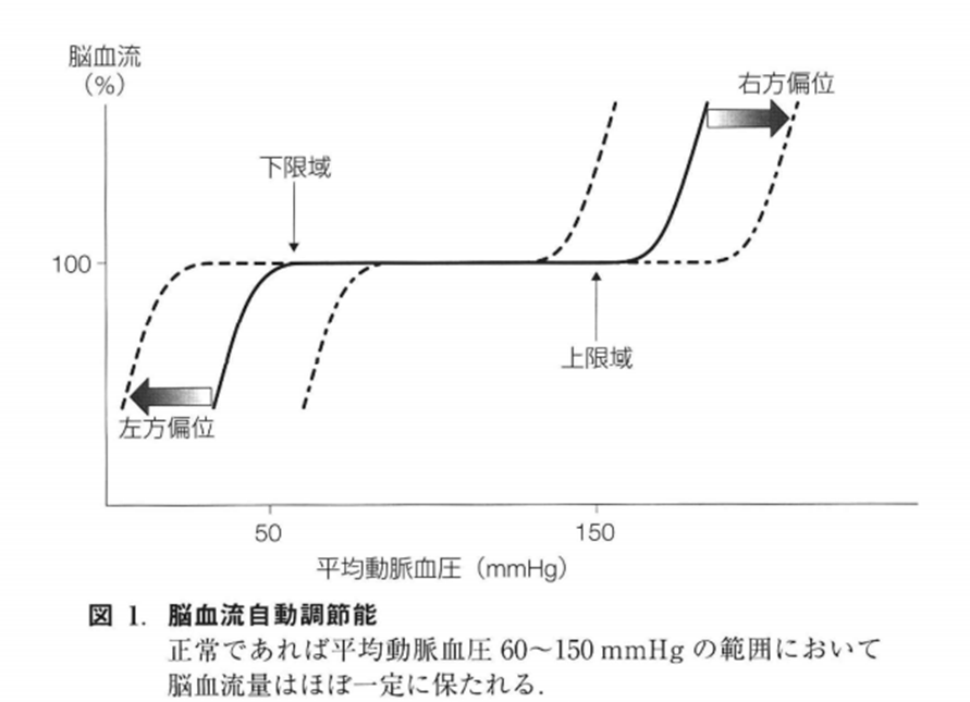図の横軸は血圧を表していて、左に行くほど血圧が低く、右に行くほど高くなります。一方、縦軸は脳の血液の流れの量を表していて、上に行くほど血流が多いことを示しています。中央の黒い線は、通常の血圧の範囲内で脳の血流が一定に保たれる仕組みを示しています。この調節は、血圧が約60~150 mmHgの範囲で働きます。この範囲内では、血圧が少し変化しても脳の血流はほとんど変わりません。