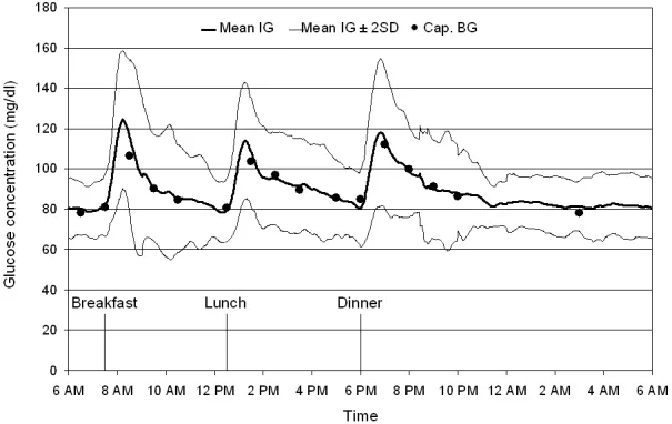 この図は、健常者男性の1日を通した血糖値の変化を示しています。黒い太い線は、健康な人たちの平均的な血糖値の動きを表しています。細い線は、その平均値から少し上下にばらつきがある範囲を示しています(±2SD, 95%の人がここに含まれる)。図を見ると、食後の血糖値の上がり方は比較的穏やかで、「血糖値スパイク」(食後1-2時間のうちに急激に高血糖:140mg/dl以上となる)の状態ではないことがわかります。また、朝食や夕食の後に比べて、昼食後の血糖値の上がり方はそれほど大きくないこともわかります。